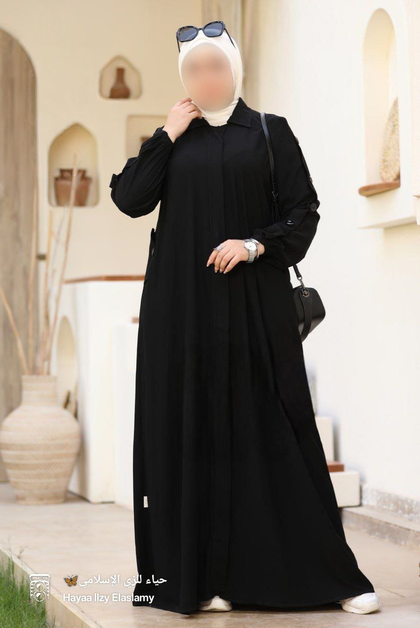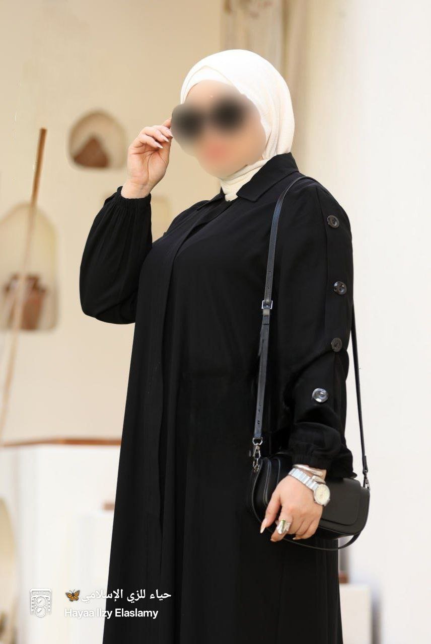 عبايه بديزاين انسيابي وسوسته كامله مخفيه و اربع ازرار من ع الكم واستك ف نهاية الكم وجبين مطعمين بزرار